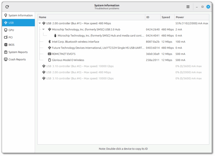 - USB: lista los dispositivos conectados por USB, su tipo, nombre, ID, agrupados por controlador. También indica velocidad y potencia del puerto — clave si querés diagnosticar problemas de rendimiento o dispositivos que no funcionan bien.