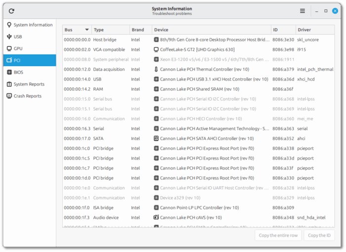 - PCI: informa sobre los componentes internos conectados vía PCI — tipo, marca, driver, ID — útil cuando querés saber qué placas tenés, qué controladores usan, etc.