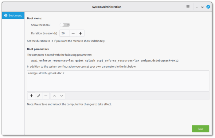Como parte del mismo esfuerzo de mejoras, los desarrolladores sumaron una nueva herramienta llamada “System Administration”. Por ahora está centrada en administrar el menú de arranque (GRUB): permite mostrar u ocultar el menú, configurar el tiempo que espera antes de arrancar, agregar parámetros de arranque, etc. Esto resulta de gran ayuda en entornos con dual-boot, múltiples kernels o cuando se necesita ajustar parámetros para troubleshooting.