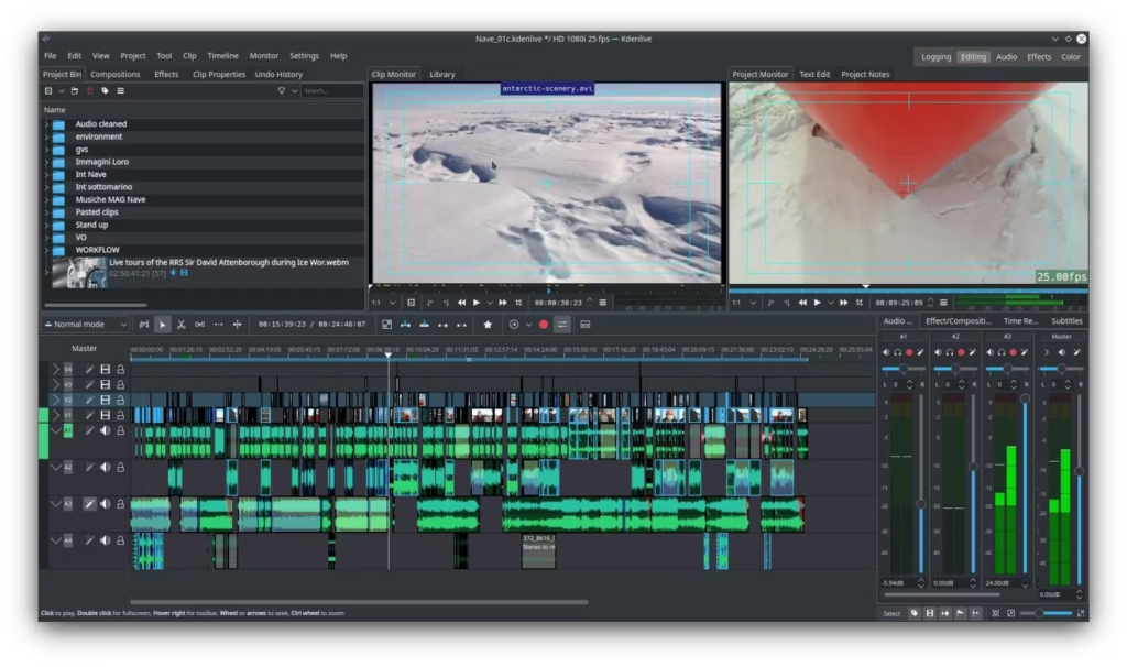 Kdenlive es uno de los editores más completos y populares en Linux. Ofrece una experiencia bastante cercana a lo que encontrarías en editores profesionales.