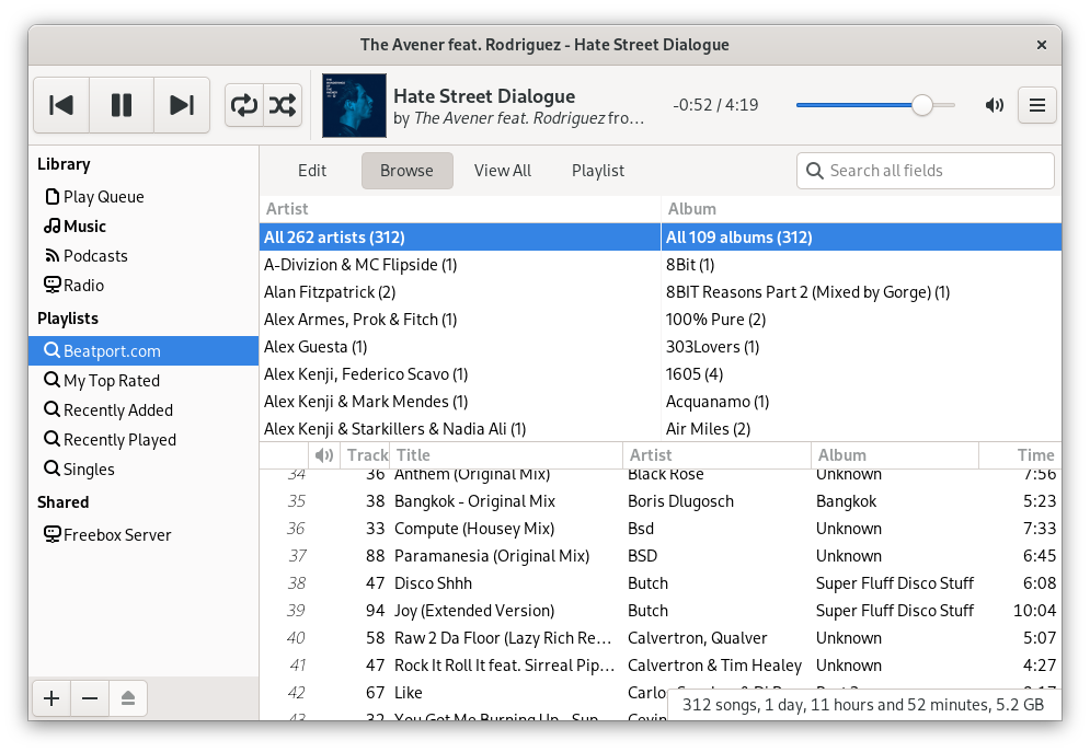 Reproductor ligero basado en GTK que combina simplicidad y limpieza, Pragha es ideal para escritorios XFCE o ligeros.