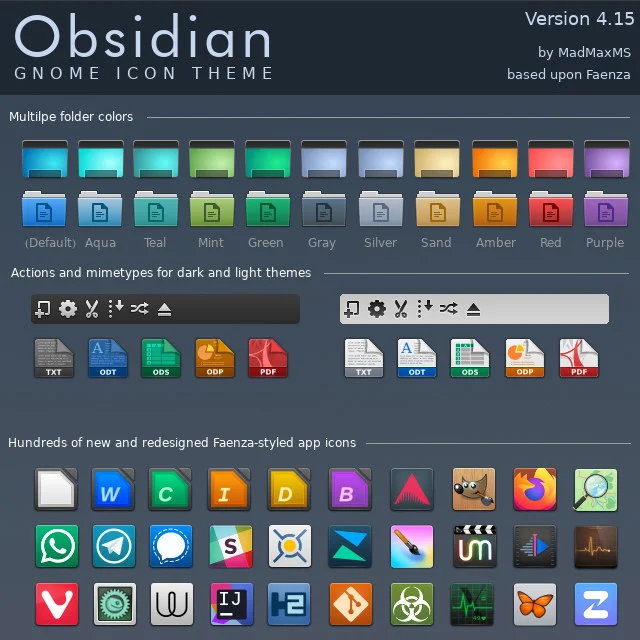 Basado en Faenza, Obsidian se caracteriza por iconos brillantes, sombreados y con gran profundidad visual. Excelente para escritorios con estilo «vintage» o tradicional.