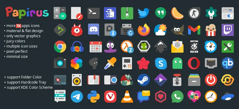Papirus es uno de los temas más populares y completos. Posee una estética moderna, plana y colorida, con soporte para miles de aplicaciones. Se actualiza con frecuencia y tiene variantes oscuras y claras.