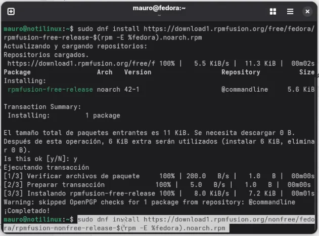 Deberías ver listados como rpmfusion-free y rpmfusion-nonfree. Si alguno no aparece, revisa los pasos anteriores e intenta nuevamente.